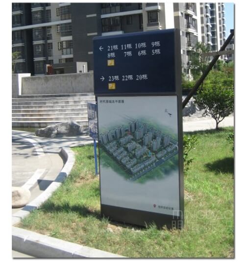 明道標識承接了時代景城小區標識系統項目的設計、制作及安裝,針對該樓盤簡約現代的建筑風格,明道在為其設計標識系統時,運用簡潔、現代、大氣的色調與形狀,將建筑格局及服務功能有效指引導示,讓人一目了然,為該樓盤營造出了快捷便利的生活感。