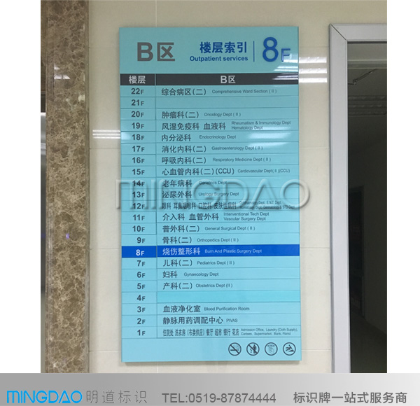 項目內容包括:樓頂發光字、形象標識、戶外指示牌、索引牌、停車場指示牌、大堂導向牌、宣傳欄、公告欄、室內發光吊牌、樓層指示牌、科室牌、衛生間門牌、功能標識牌等。