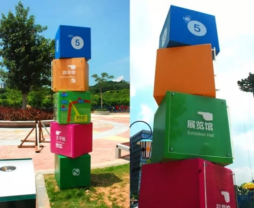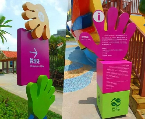 游樂場標識首先要服務于公眾,它并非僅僅是一樣藝術作品,它要求更多的依照人體工程學、感性知覺等方面原理,以設計出滿足觀看者需要的標識導視系統。相比較而言,室外環境中的標牌要比室內標牌復雜得多,在整個城市標識系統也占據著更為重要的位置,之所以說它復雜,是因為它不僅僅是環境中的因素、環境里的參與者,更是環境的創造者,去體現整個環境的主題式物體。