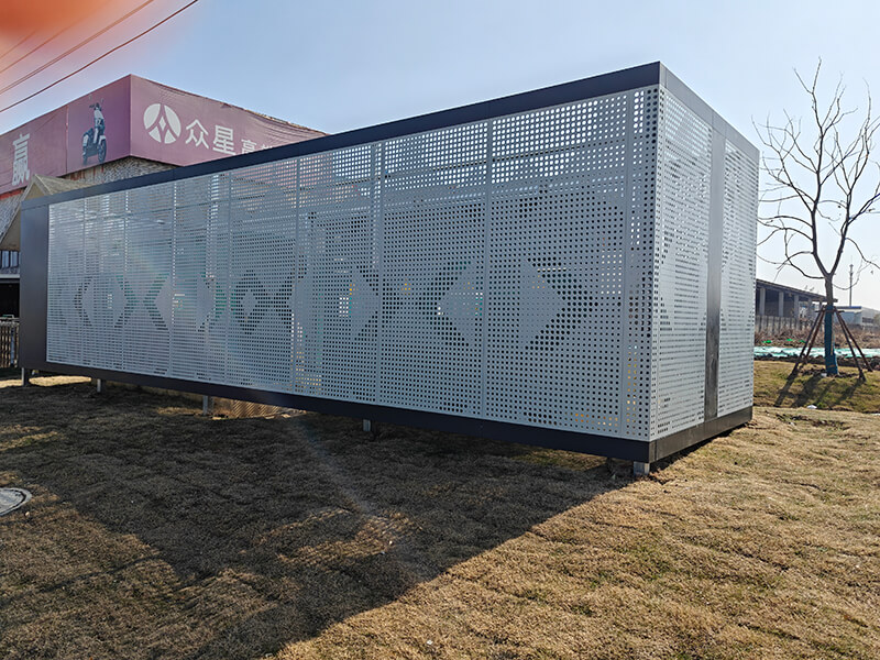 圍擋箱主要由灰色框架和白色穿孔板構成,穿孔板上有著規則排列的細小孔洞,形成了獨特的紋理。穿孔板上還裝飾有一些幾何形狀的鏤空圖案,包括箭頭和菱形,增加了視覺上的層次感和設計感。