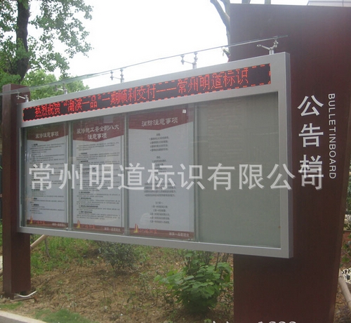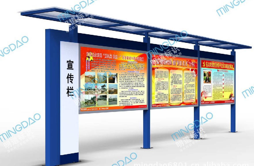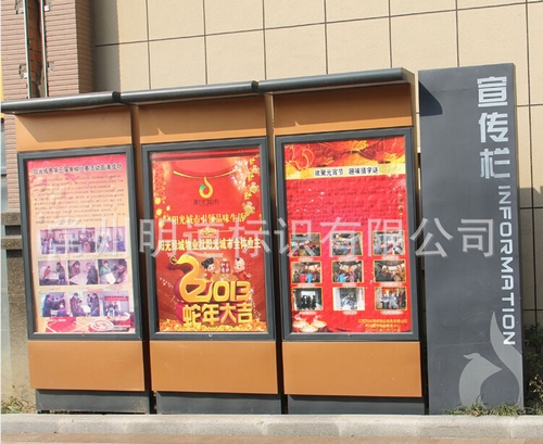 【產品介紹】 宣傳欄,是組織或企業單位等進行自我宣傳的有效手段。它常被應用于街道,工廠,小區,酒店等公共場所,采用不銹鋼或鍍鋅板為框架,鋼化玻璃或者耐力板為面板,鋁合金為頂棚,面板可以打開更換宣傳畫面。 明道標識專業制作各類宣傳欄:不銹鋼宣傳欄、宣傳欄制作、戶外宣傳欄、小區宣傳欄、公司宣傳欄、室內宣傳欄、廣告宣傳欄、宣傳櫥窗。