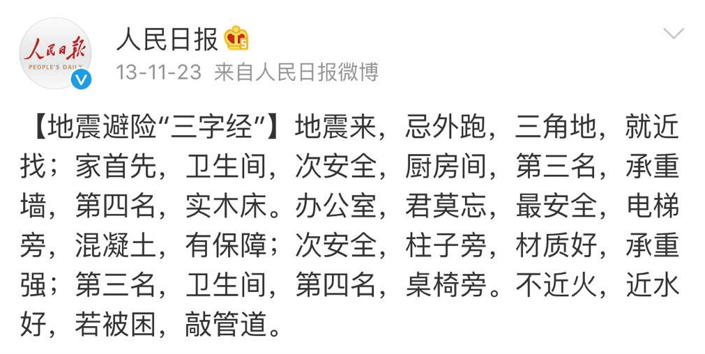 地震來了千萬不要慌張,要穩(wěn)定自己的情緒,尋找穩(wěn)固的躲避區(qū),并注意保護(hù)自己的頭部。國際通行的地震逃生原則“蹲下、掩護(hù)、抓牢”,到目前仍然是有效的。當(dāng)房子晃動(dòng)的時(shí)候,可以躲在安全的地方,等待不晃的時(shí)候往下一個(gè)地點(diǎn)轉(zhuǎn)移,在下一波震動(dòng)來襲之前,躲在新的可藏身的安全之處。