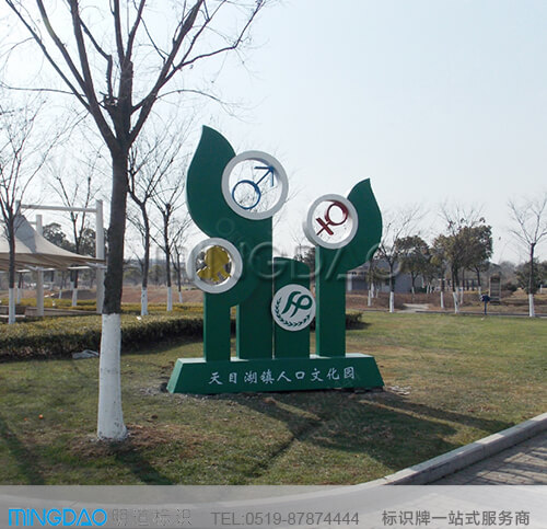 戶外廣告標識。多用鋼板或不銹鋼板烤漆制作,也有石材,木材或其他建筑材質來制作的,起到展示企業形象和地標的效果。天目湖人口文化公園的