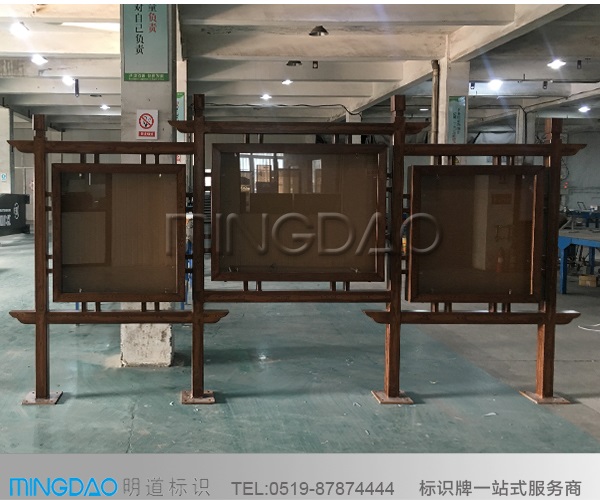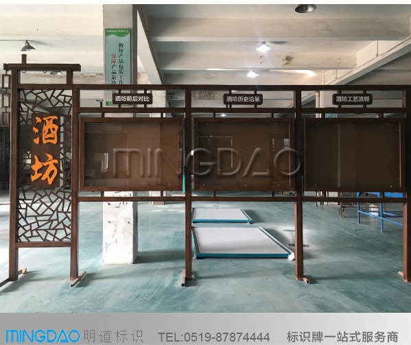宣傳欄是明道標識為酒坊村設計制作的宣傳招牌,展現了酒坊的歷史變革、釀酒工藝和人文情懷。木紋漆具有很好的仿古效果,搭配鈑金材料,讓這套標識牌既具有防潮、防腐、防蛀、防銹、耐高溫、易清理、色彩亮麗不脫色的性能優勢,在外觀效果上也能達到防腐木標識牌的歷史厚重感。